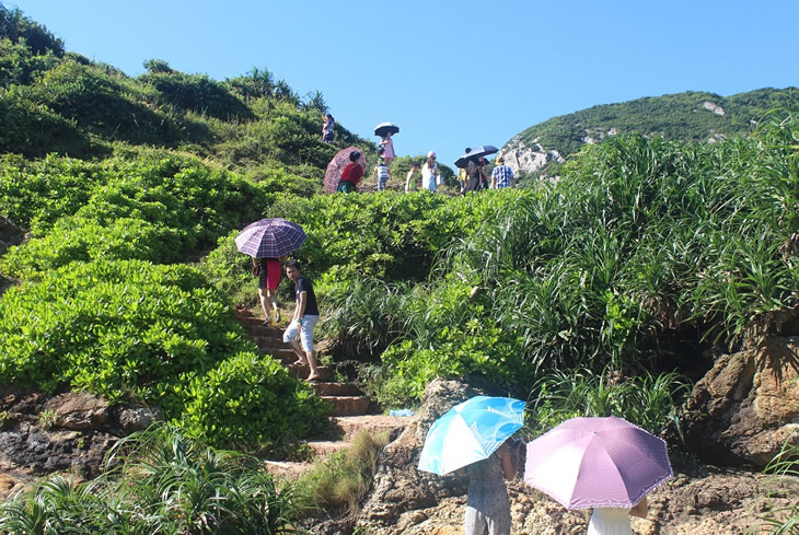 第二天,我起得很早,就為了記錄海邊的冉冉升起的太陽,而大部分同事們因?yàn)樽蛲響?zhàn)斗得太晚,還在夢里水鄉(xiāng)。太陽完全升起后,我一個個宿舍的敲門,叫醒了同事們,大家草草解決了早餐,然后一起去參觀了當(dāng)時周星馳拍攝《魚美人》的拍攝基地,領(lǐng)略了楊梅坑真正讓人回味的無限風(fēng)光,我在想,當(dāng)時大導(dǎo)演之所以選擇這里做為拍攝基地,不也是因?yàn)檫@里的美景嗎?除了美景,在我看來,這里的房子也是很有特色的,房子都是小木屋結(jié)構(gòu),很矮但很別致,和周圍的青山綠水相依,不得不讓人有一種想在此住上一晚的強(qiáng)烈沖動。